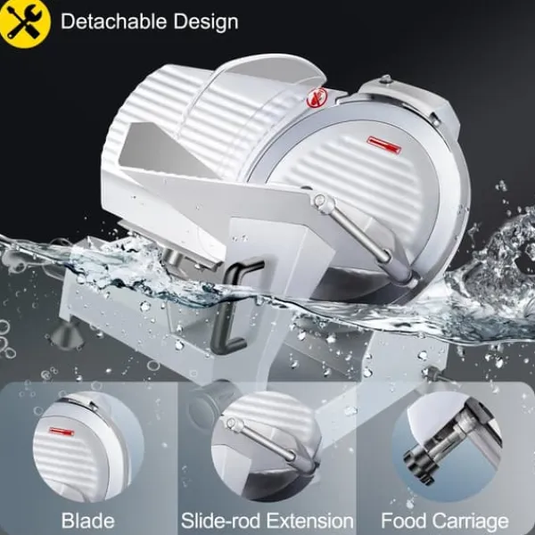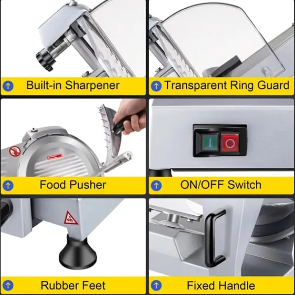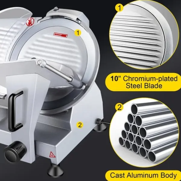 -Utmärkt prestanda: Denna köttskärare är konstruerad med en gjuten aluminiumkropp, som är rostsäker, korrosionsskyddande och lätt att rengöra. Det förkromade stålbladet med en diameter på 10 tum har en vass kant utformad för snabb skärning.