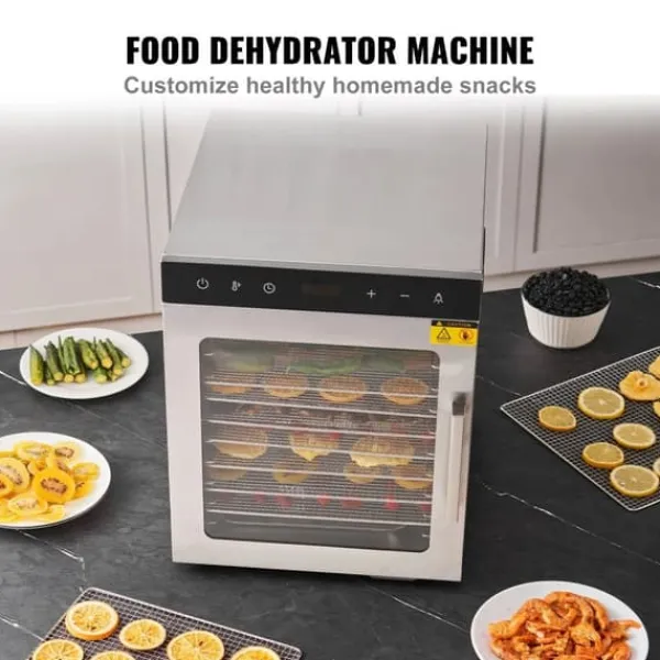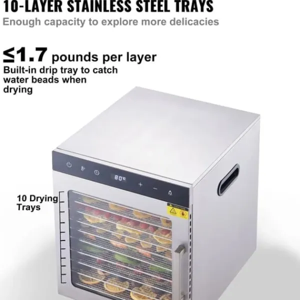 -Den har 10 brickor i rostfritt stål och 800 watt effekt. Torka enkelt en mängd olika frukter, grönsaker och gör nötkött ryckigt. Dehydratorns 360° kontinuerliga luftflöde säkerställer oändliga möjligheter.