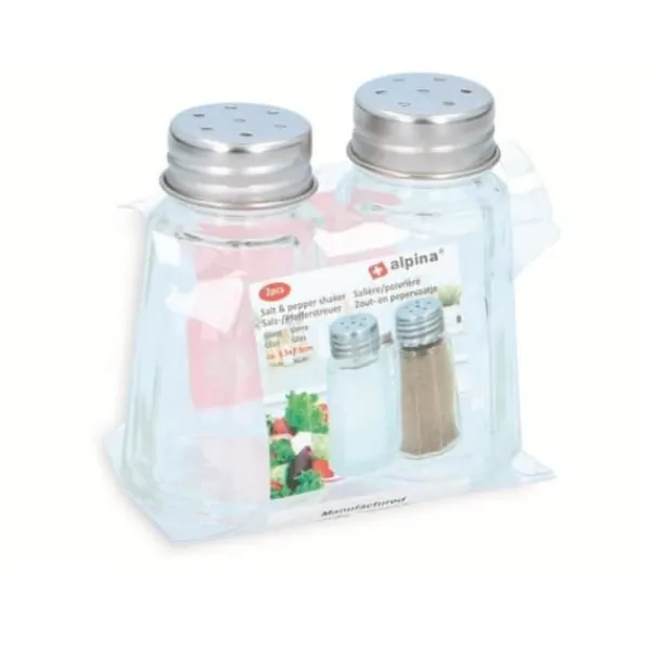 Alpina salt- och pepparglas Alpinas salt- och pepparglas gör det enkelt att tillsätta salt eller peppar till din mat. Eftersom burkarna inte är för stora kan du enkelt förvara dem. Burkarna rymmer upp till 60 gram. Beskrivning Märke: Alpina Storlek: 70 x 40 x 75 mm Material: Glas