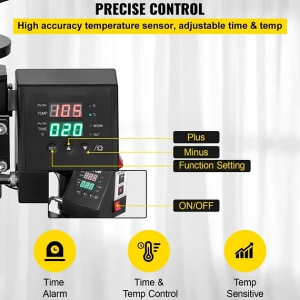 Digitalt styrsystem: Denna värmpress är utrustad med ett exakt kontrollpanel som hjälper dig att noggrant reglera temperatur och tid. När värmeprocessen är avslutad, ljuder ett automatiskt alarm för att påminna dig om att ta ut föremålen. Temperaturintervall: 0-250 °C; Tidsinställning: 0-999 sekunder; Effekt: 650 W; Spänning: 220 V.