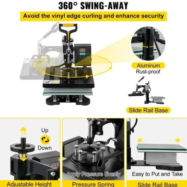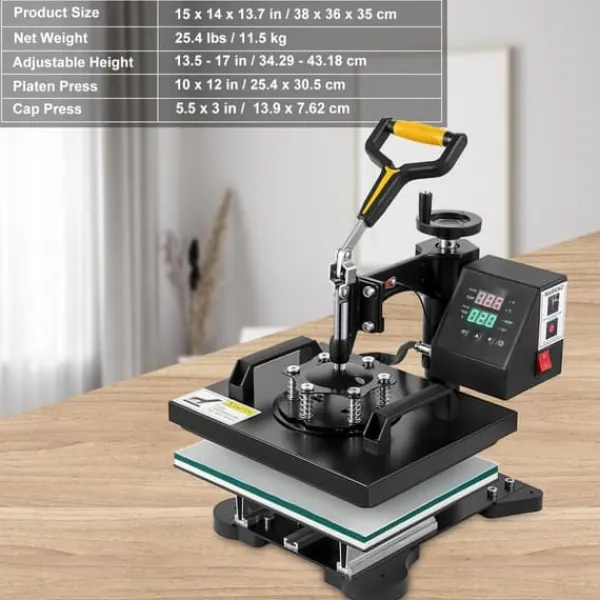 Platta & böjda pressar: Tillsammans med en böjd press för kepsar erbjuder värmepressen med 10 x 12 tum stor sublimationspress gott om designutrymme för grundläggande värmepressprocesser. Dessutom säkerställer den tjocka plattan bättre värmebevarande och en jämn värmekonsistens.