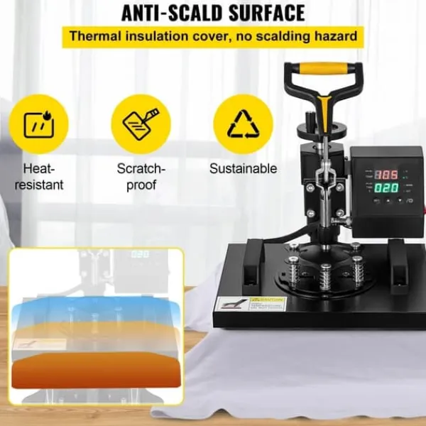 Effektiv isolering: Denna Teflonbelagda värmpress minskar risken för brännskador under överföringar. Den är lätt att rengöra och ger ett jämnare tryck. En jordkabel finns också för säker drift.