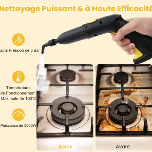 Denna 2000W ångtvätt levererar högtrycksånga upp till 160°C för effektiv borttagning av smuts och fläckar på olika ytor. Den har en stor vattentank för förlängd rengöringstid, flera säkerhetslås och mångsidiga tillbehör för olika rengöringsuppgifter, allt utformat för enkel manövrering och effektiv användning.
