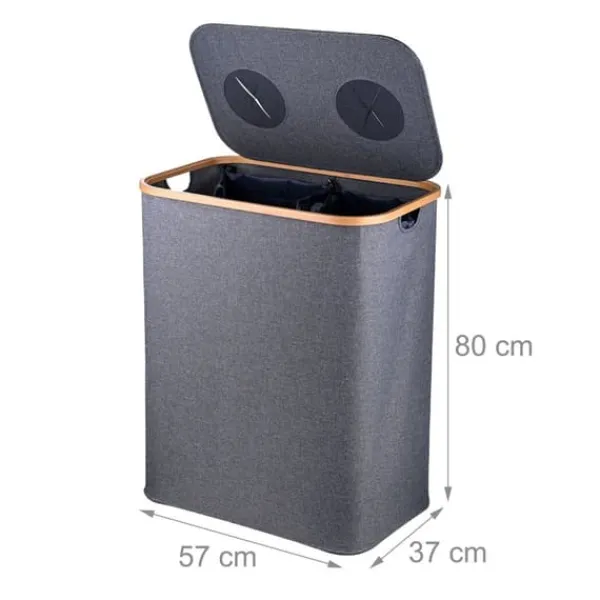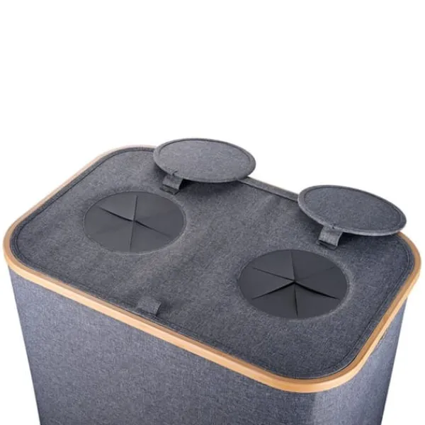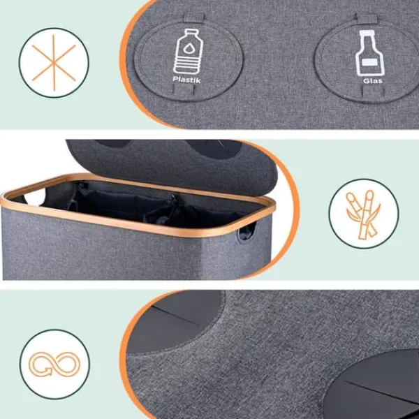 Denna återvinningsbehållare är perfekt för att organisera och separera glas- och plastflaskor i ditt kök, källare eller tvättstuga. Den har två avtagbara innerpåsar för enkel tömning och en modern design med naturliga bambudetaljer, som kombinerar funktionalitet med stil.