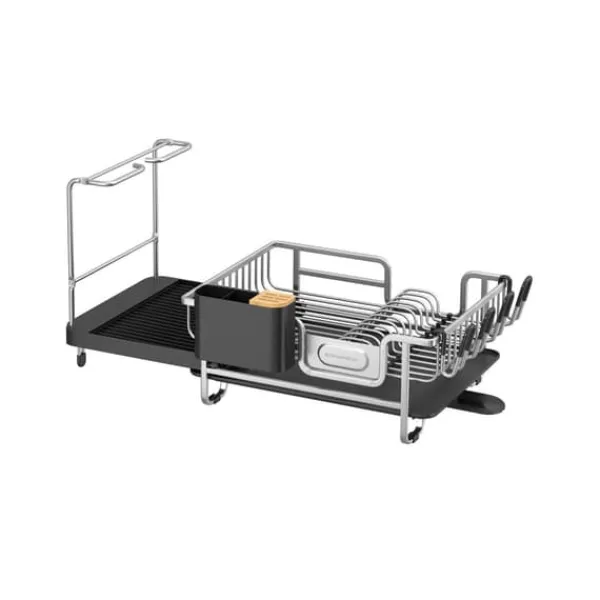 Hoogenboezemwonen Diskställ, Rostfritt Aluminium, Utdragbart Droppkärl 53,5-71,6 cm, Svängbart Pip, med Glas- och Mugghållare, Silversvart – Utbyggbar och Justerbar Design: Detta diskställ har ett droppkärl som kan förlängas från 53,5 cm till 71,6 cm. Detta gör att du kan justera avrinningsytan för att skapa mer förvaringsutrymme eller spara utrymme på bänkskivan. Den 360-graders svängbara pipen under diskstället gör att du kan placera det på den längre eller kortare sidan av diskstället, så att vatten kan rinna ner i diskhon från båda sidor. Högkvalitativ Prestanda: Den solida aluminiumramen är rostbeständig och den anodiserade, borstade ytan är olje- och fingeravtrycksbeständig, vilket gör att du kan hålla den ren med minimalt underhåll. Droppkärlet i PP-plast med en speciell beläggning fördelar vattnet för effektivare torkning. Produktdetaljer: Färg: Silversvart Material: Aluminium, PP-plast Mått: (53,5-71,6) x 32,3 x 33,3 cm (L x B x H) Vikt: 2 kg Leveransomfattning: 1 x Diskställ 1 x Tillbehörspaket 1 x Bruksanvisning