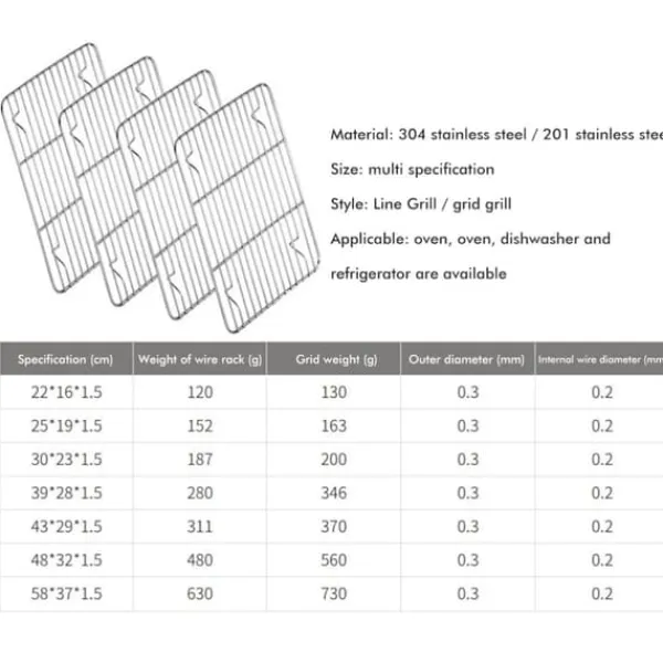 1、 Ingen galvanisering, ingen beläggning, så det finns ingen anledning att oroa sig för kemikalier, skalar av skräp i maten. Hela gallret är tillverkat av rostfritt stål av livsmedelskvalitet 304. Professionella bakställ är förtroendebeständiga och kräver inte täta byten 2、 Stabil struktur, solid fyra fots svetsning, god styrka och hållbarhet, motstånd mot vridning och skakning. Höjden på 1,5 cm lyfter maten och låter luften cirkulera runt pannan för perfekt tillagning och kylning utan att vända maten.