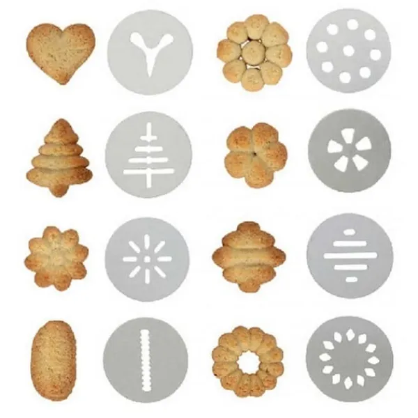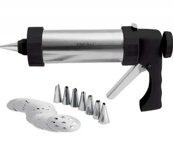 Maskin för att göra kakor och dekorera bakverk – Stålkolvstång – ABS-spak – Justerbar kaktjocklek – 8 kakskivor – 8 dekorationsmunstycken – Lätt att rengöra – Trycker hela degen genom cylindern, utan att täppa till – Lätt att hålla och kontrollera. squeezer