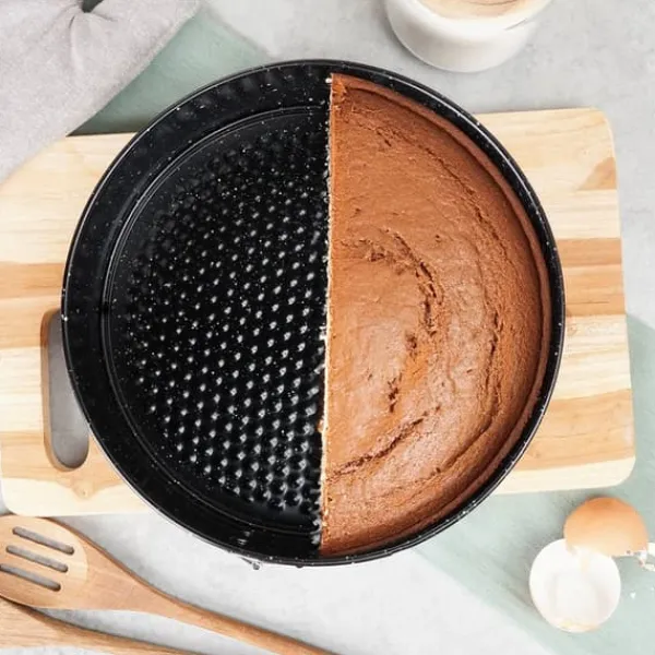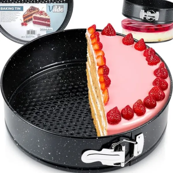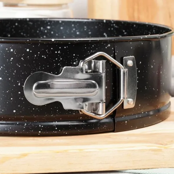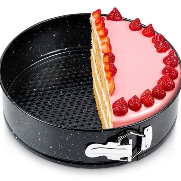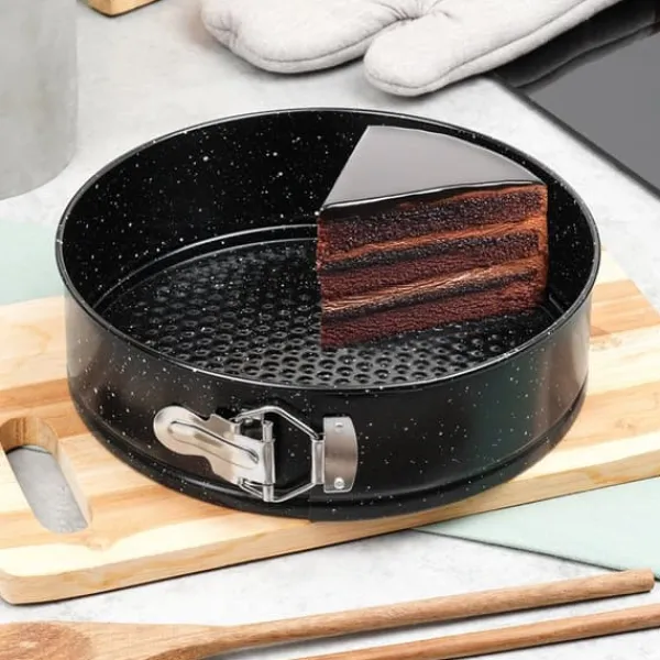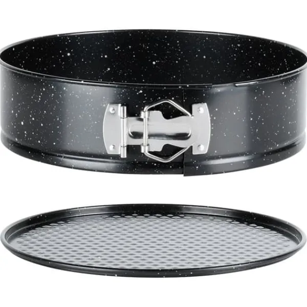 Rund kakform med granitöverdrag. Kanterna på springformen är töjbara. Pannan är lämplig för gas- och elugnar.