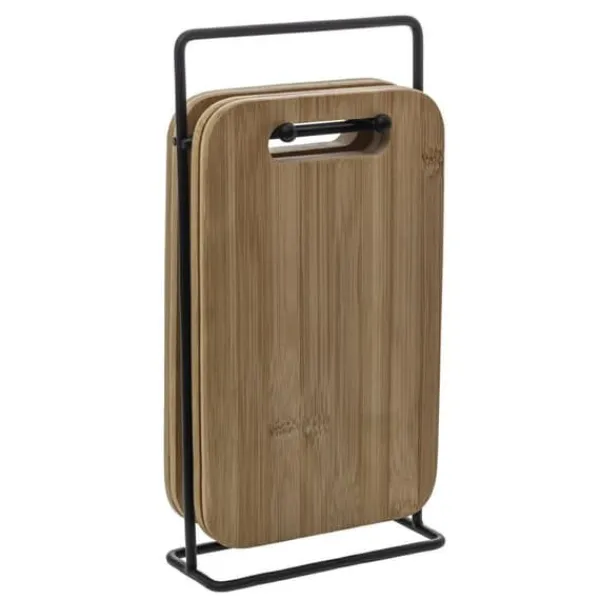 Denna uppsättning av 4 skärbrädor med metallstativ är en innovativ och snygg lösning somkommer att göra vilket kök som helst mer funktionellt. Brädorna är gjorda av naturlig bambu och är inte bara lätta utan också exceptionellt hållbara. De hängande hålen gör dem lätta att förvaraoch deras eleganta design ger ditt kök en modern touch.