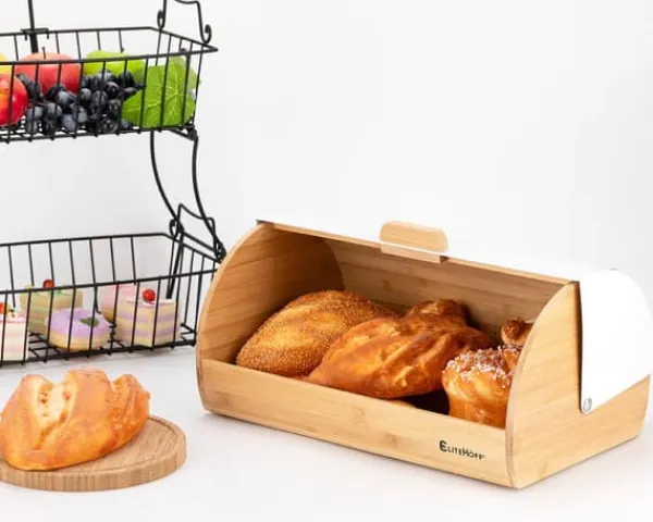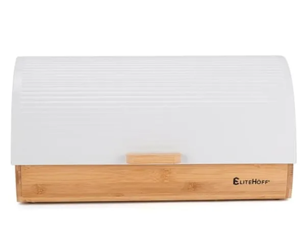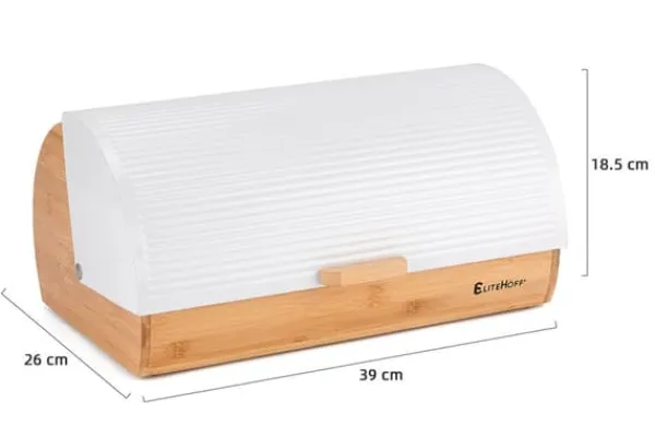 Den moderna formen på brödlådan, dess attraktiva form och kombinationen av vit metall och bambu ser bra ut på bänkskivan. Specifikation: Kropp gjord av bambuträ. Glänsande vit stålkåpa Lätt att öppna. Utrymmes sparande. Designad för förvaring av alla typer av bröd. Attraktiv, modern design. Tillverkad av ekologiska material. Förpackning: färgglad kartong. Färg: vit/ljus trä. Brödlådans mått: Längd: 39 cm Bredd: 28,5 cm Höjd: 18,5 cm