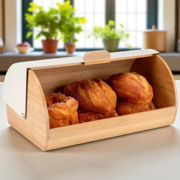 Upplev den perfekta kombinationen av stil och funktionalitet med vår moderna brödkorg i bambus. Den eleganta designen, som förenar svart metall med naturligt bambuträ, gör att denna brödkorg blir en iögonfallande detalj på ditt köksbord. Den är inte bara vacker, utan också praktisk – med en lättöppnad lock och en smart konstruktion som sparar plats, är den idealisk för att förvara alla typer av bröd.