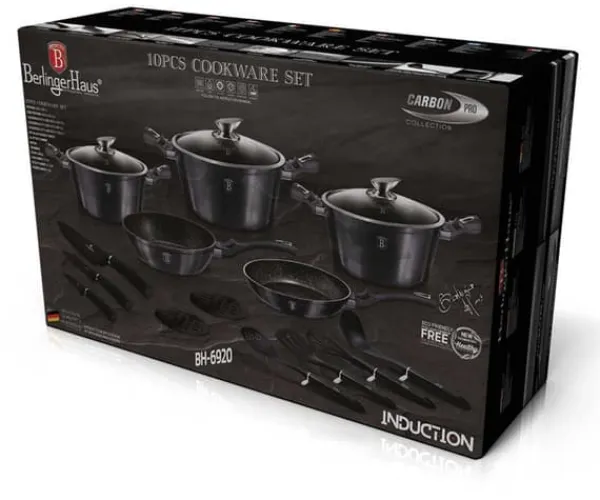 Köksredskap i serien CARBON PRO från BERLINGER HAUS är tillverkade av högkvalitativt gjutet aluminium täckt inuti med en trippel granitbeläggning (marmor) med en mycket hög hårdhetskoefficient. Ytterskal i metallisk grafitfärg. Dessa snygga och fashionabla rätter är utrustade med SOFT TOUCH-handtag (silikonhandtag) som standard. Lämplig för alla typer av spisar: gas, el, keramik, halogen, induktion. TURBO INDUCTION-systemet (värms upp mycket snabbt) gör att du kan spara upp till 35 % energi. Setet innehåller: Gryta Ø20 x 10,4cm 2,5L Gryta Ø24 x 11,8cm 4,1L Gryta Ø28 x 12,4cm 6,1L Stekpanna Ø20 x 4,5cm 1L Stekpanna Ø24 x 6,5cm 2,3L Termoplast nylon skimmer – kokkärl – kökskniv universalkniv – skalkniv Stativ för varma rätter – 2 st Egenskaper: Trippel granitbeläggning som förhindrar att maten fastnar Material: högkvalitativt gjutet aluminium Soft-Touch Handtag: Silikonhandtag Glaslock med ventil ingår x 2 (passar även stekpannor) TURBO INDUCTION system (värms upp energisäker för alla typer av matlagning, 35% mycket energisnål). keramik, halogen, induktion Färg: grafitmetallic Granitbeläggning är en teflonbeläggning berikad med granitpartiklar, vilket ger den större hårdhet. Det är hårdare än teflon, men behåller sina fördelar: det brinner inte och fördelar värmen bra. Kombinerar fördelarna med kokkärl i gjutjärn och teflon. Den har alla fördelar med teflon, men är mer motståndskraftig mot skador och överträffar till och med keramiska beläggningar. Granitbeläggningen gör disken exceptionellt reptålig och hållbar. Denna typ av grytor och stekpannor tillåter också stekning med en minimal mängd fett, eftersom kärlet värms upp på samma sätt som en sten och avger värme över hela ytan. Sammansättningen av aluminiumkroppen och den ferromagnetiska botten möjliggör användning på induktionsspisar och alla andra typer av spisar och användning av de bästa acktermiska egenskaperna hos gjutet och smidd aluminium på alla spisar och spisar.