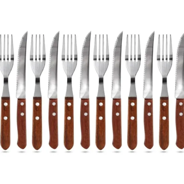 Biffbestickset Material: rostfritt stål, trä Detaljer: – Biff- och pizzabestickset (12 stycken), innehåller en tandad kniv (6 stycken) och en gaffel (6 stycken). – Rejäla handtag med 2-punkts stålnitning. – Förpackad i en elegant blister – Rekommenderas inte för diskning i diskmaskin Mått på knivar total längd: 20,5 cm bladlängd: 11 cm handtagslängd: 9,5 cm handtagstjocklek: 1,0 cm Mått på gafflar gaffellängd: 18,5 cm handtagslängd: 9,5 cm gaffelbredd: 2,5 cm handtagstjocklek: 1,5 cm.