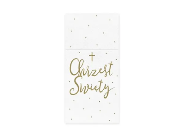 Pappersservetter med ficka för bestick ”Heliga dopet” i vitt med guldtryck, mått på den vikta servetten ca 10 x 20 cm.