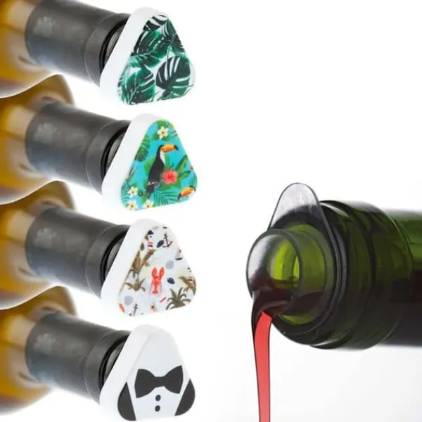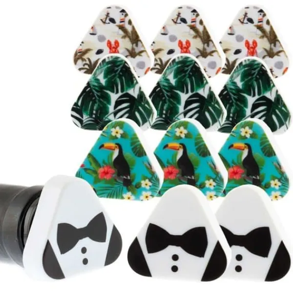 Ant-droppande hälla Koala Spanien, 12 enheter med varierande mönster. Lätt att ta bort tack vare fliken och hermetisk förslutning för att bevara vinet. Tillverkade av återvinningsbara plaster (PE och PS). Mått: 3,4 x 3,4 x 8,9 cm, vikt: 16 g.