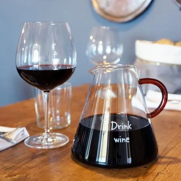 Brocca dekanter i borosilikatglas med brun handtag och dekorativ text. Dess moderna form gör denna dekanter unik och originell. Kapacitet: 1,6 L.