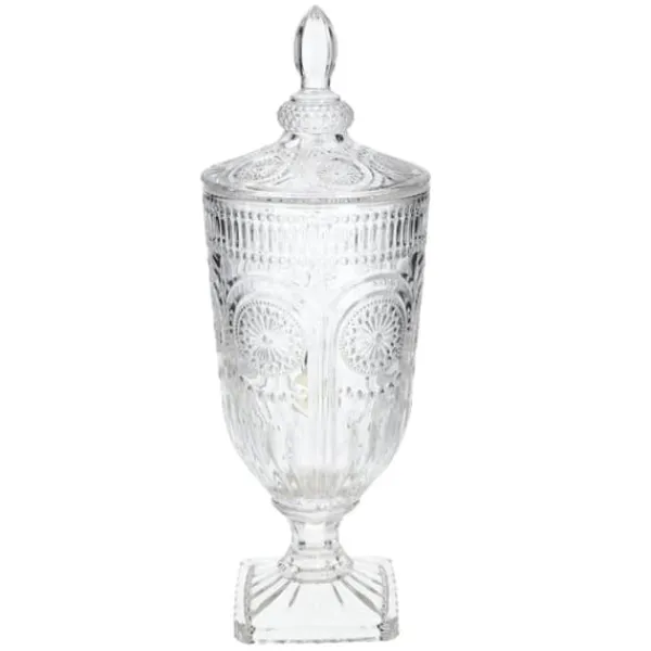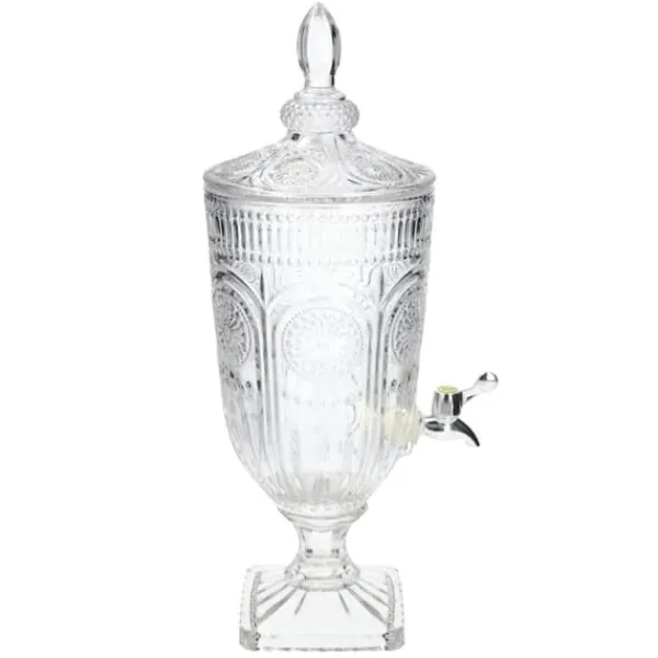 FATRUM med en kapacitet på 2,8 l är ett perfekt tillbehör för alla typer av evenemang. Tack vare användningen av transparent glas kan du övervaka innehållsnivån i realtid och bekvämt servera drycker med hjälp av den läckagesäker kran . Burken har en rundad form, vilar på en solid och stabil fot , och locket har en praktisk knopp som fungerar som ett handtag. Väggarna är dekorerade med ett strukturellt, öppet mönster som påminner om arabesker. Burken är 17 cm bred. Material
