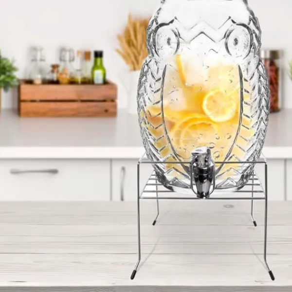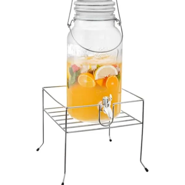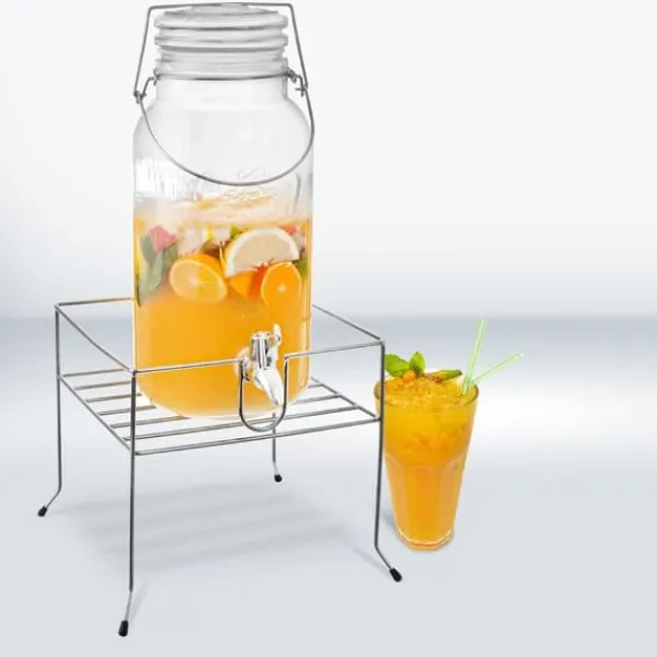 Burkställ med kran för drycker. Den universella storleken gör den lämplig för de flesta behållare från 3 till 8 liter. Stativet gör det mycket bekvämare att använda burken med en kran. Lätt att rengöra – för att rengöra kromytan, använd diskmedel, en svamp och en trasa. Använd inte frätande vätskor eller metallsvampar.