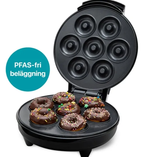 Champions Donut Maker Ceramic har en non-stickbeläggning som är specifikt testad för att säkerställa att den är fri från PFAS*. Den är perfekt för dig som älskar munkar och enkelt vill göra dina egna minimunkar hemma utan att fritera. Förbered smet, häll i och vänta några minuter. Pudra med vaniljsocker eller toppa med smält choklad och strössel, bara fantasin sätter gränser. Njut sen av nygräddade munkar. När indikatorlampan visar att rätt temperatur är uppnådd gräddar Champion Donut Maker sju munkar i taget. Non-stickytan gör rengöringen enkel, torka av med en trasa eller papper och den är redo att användas igen.