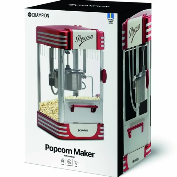 Champion Popcornmaskin Retro är för dig som vill göra goda popcorn med biografkänsla hemma. Höj stämningen vid hemmabiokvällen, festen eller barnkalaset. Maskinen klarar även det stora sällskapet tack vare den väl tilltagna kastrullen. Maskinens fönster och belysning gör det enkelt följa poppningen och på ett par minuter har du krispigt goda popcorn klara.