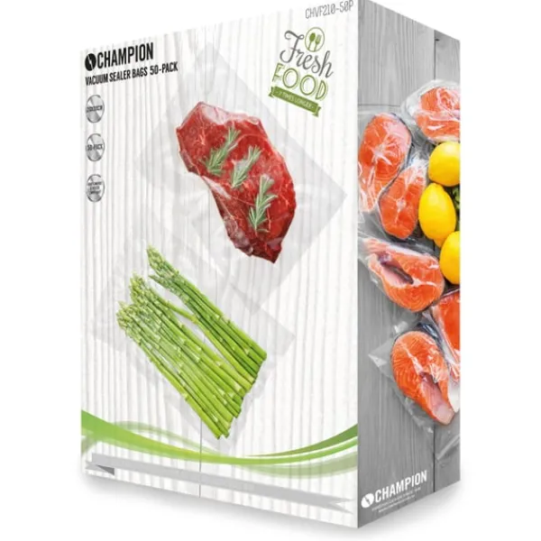 Med Champions vakuumpåsar kan du vakuumförpacka din mat på ett säkert och hållbart sätt. Påsarna kan användas i mikrovågsugn samt i sjudande vatten, vid t.ex. Sous Vide-tillagning och kan frysas. Kan med fördel återanvändas och tål maskindisk.