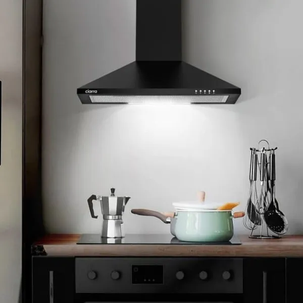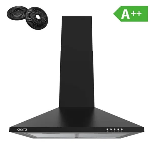 CIARRA CBCB6201 köksfläkt kombinerar modern design med energieffektivitet i klass A++. Den är 60 cm bred och har en maximal luftflödeskapacitet på 370 m³/h. Levereras med två kolfilter för återcirkulation eller utsugning.
