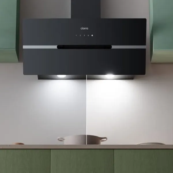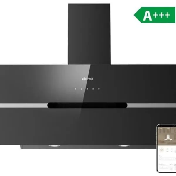 CIARRA CD9736FB är en lutande och elegant köksfläkt i svart glas med kraftfull DC-motor (85W). Den erbjuder fyra ventilationshastigheter, inklusive booster, och ett maximalt luftflöde på 650 m³/h. Du styr den enkelt via pekskärm eller appen Smart Life via Wi-Fi.