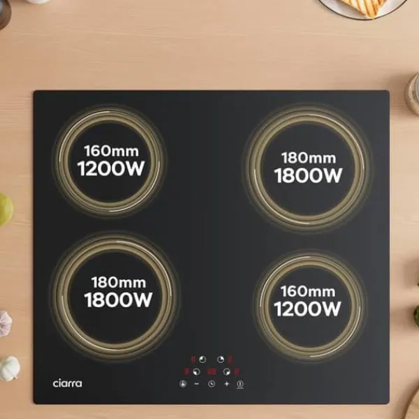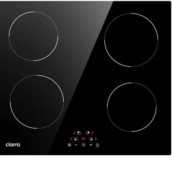 CIARRA:s 59 cm induktionshäll kombinerar snabb och energieffektiv matlagning med en modern design. Med fyra separata kokzoner och en total effekt på 6000W garanterar den snabb uppvärmning. Den digitala displayen och de känsliga touchknapparna gör hanteringen enkel och exakt.