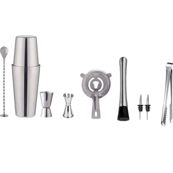 Drinksked, cocktailsil, måttglas: Drinkskeden är tillräckligt lång för att nå ner och röra om i shakern. Cocktailsilen är perfekt för att hälla upp drinken men inte få med is eller fruktbitar. Det ena måttglaset rymmer 15 och 30 ml. Det andra rymmer 25 och 50 ml.