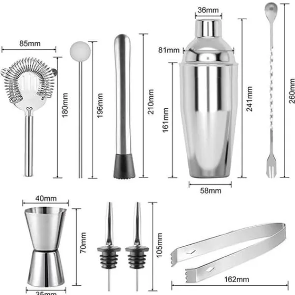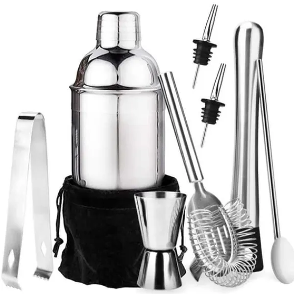Innehåller: 550ml shaker, mätglas 1cl/4cl, sil (Hawthorne strainer), istång, drinksked, sked med rör för avsmakning samt 2st droppkorkar