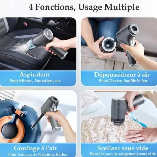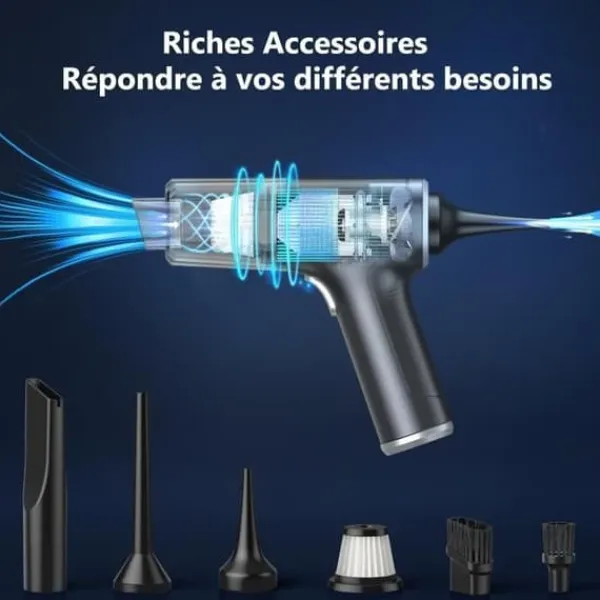 Denna sladdlösa 3 i 1 tryckluftsdammsugare och sladdlösa dammsugare är idealisk för daglig rengöring av hem, kontor och bilar. Den integrerar tre funktioner: damning, blåsning och pumpning.