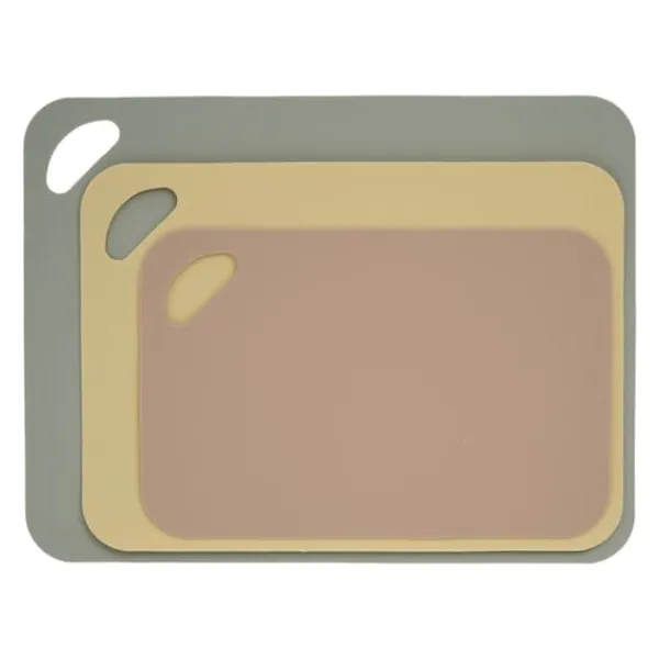 Skärbrädorna i setet är tåliga och böjbara. Det är superpraktiskt när man ska slänga rester i soporna eller när man ska ösa ned hackad lök i pannan. De är tillverkade av hygienisk plast och kan diskas i diskmaskinen.