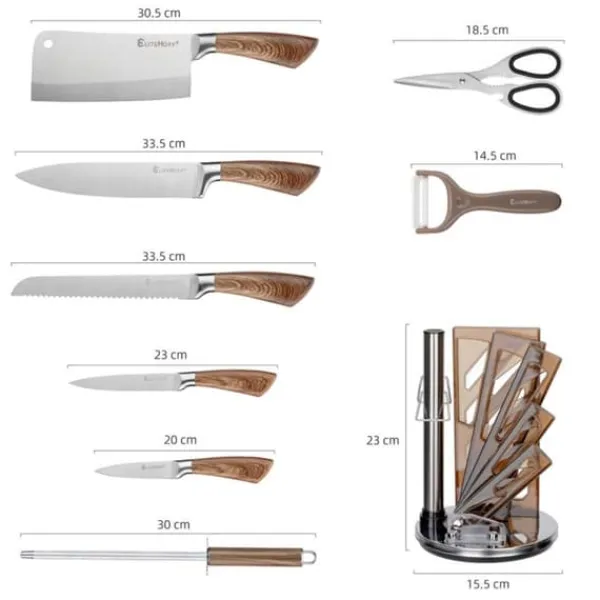 Denna 9-delade köksknivset i ett roterande, fläktformat akrylställ är ett komplett och elegant val för alla kök, vilket gör den dagliga måltidsberedningen enklare. Setet innehåller en mängd olika knivar för olika köksuppgifter – från att skiva bröd, genom att skära kött, till att hacka grönsaker, samt en skärp och sax som ökar dess funktionalitet. Det roterande akrylstativet är inte bara snyggt utan också praktiskt. Tack vare möjligheten att rotera finns knivarna alltid till hands, och stativets genomskinlighet gör att du snabbt kan hitta den kniv du behöver. Akrylstället är också lätt att hålla rent, och dess moderna utseende passar en mängd olika köksarrangemang. Setet innehåller en köksklyv, skalare, skärpning och sax. Ergonomiska handtag imiterar trä. Knivar designade för att portionera kött och fisk, skära bröd och skala och hacka grönsaker. Knivar tillverkade av högkvalitativt Ferrinox 18/10 rostfritt stål med hög kolhalt. En viktig egenskap hos detta stål är det faktum att det är motståndskraftigt mot alla typer av repor och repor, och kännetecknas av ökad motståndskraft mot nötning och korrosion. Setet innehåller: kockkniv: 33,5 cm köksklyv: 30,5 cm brödkniv: 33,5 cm universalkniv: 23 cm skalkniv: 20 cm vässare: 30 cm sax: 18 cm skalare: 14,5 cm roterande akrylstativ rekommenderas inte för handknivar handtagen. Allt är förpackat i en färgglad låda.