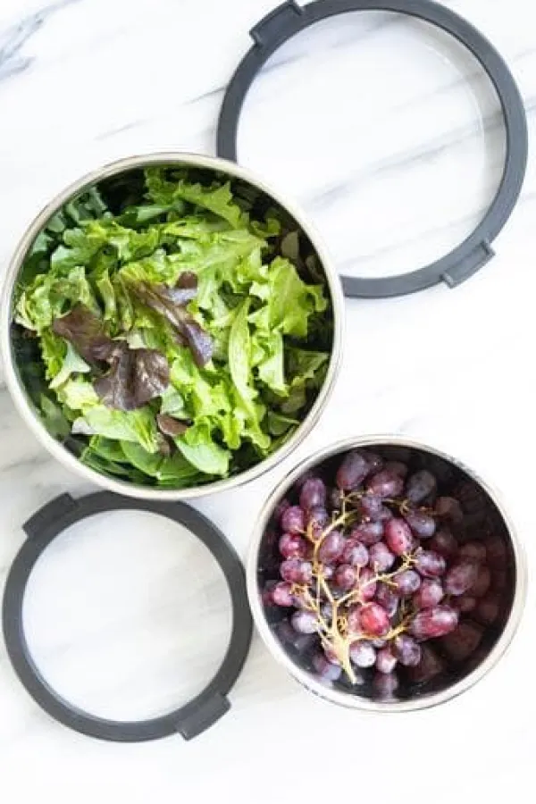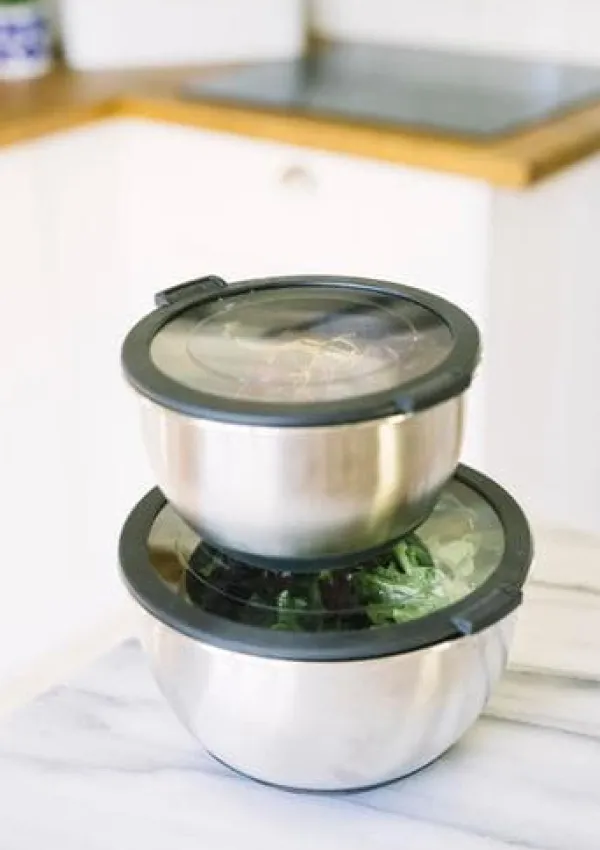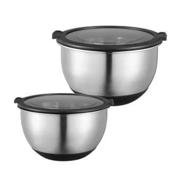 I setet ingår 2 st bunkar 2,5 & 1 liter i rostfritt stål med var sitt plastlock med silikonkant