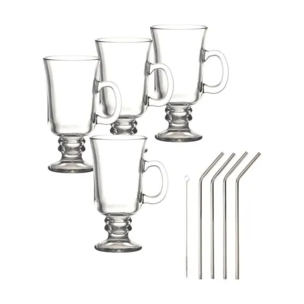 Setet Iona Irish coffe set består av fyra klassiska glas på fot med öra och sugrör i rostfritt stål så att du kan servera drinkarna på ett snyggt och extra gott sätt.
