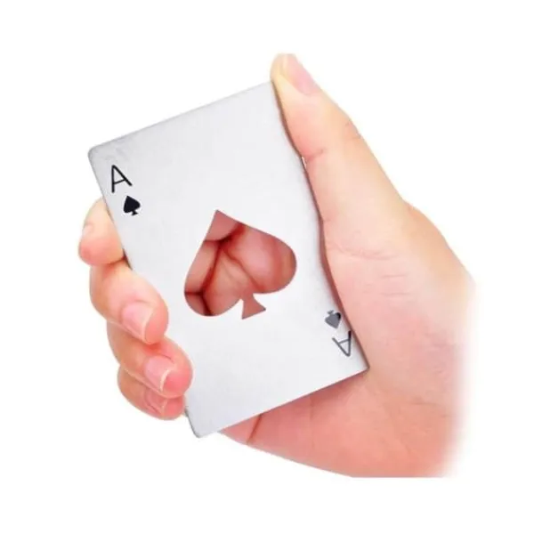 Under dina kortspel, öppna dina flaskor med öl med denna flasköppnare designad under temat för ditt favoritspel. Tillbehöret imiterar faktiskt ett spader-ess-kort med den ihåliga mitten i form av en spade.* Material: rostfritt stål * Färg: silver * Mått: 8,5 x 5,3 x 0,2 cm Funktion: flasköppnare Innehåll: 1 flasköppnare-kort Ess av spader