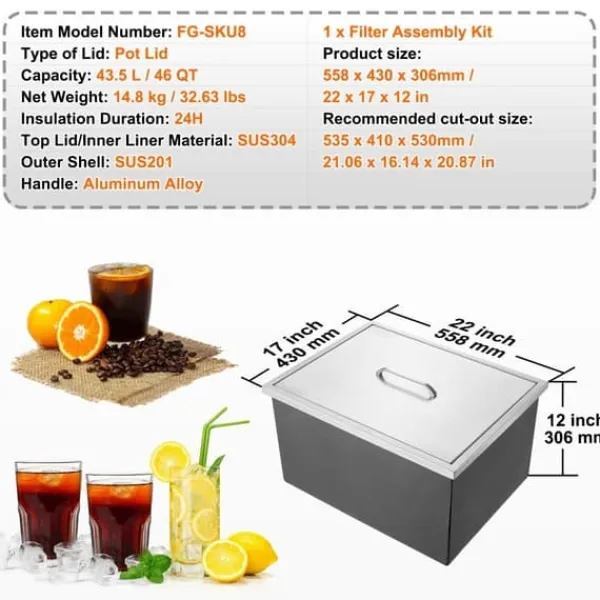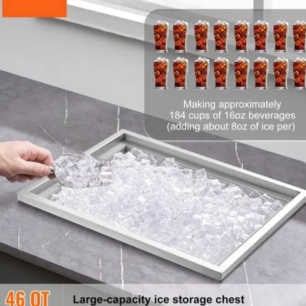 Stort kapacitet: En drop-in isbehållare med stor kapacitet som rymmer cirka 46 qt (43,5 L) is. När den är fylld kan den förbereda upp till 184 koppar med 16 oz drycker. Perfekt för att lagra en stor mängd is eller kyla olika drycker.