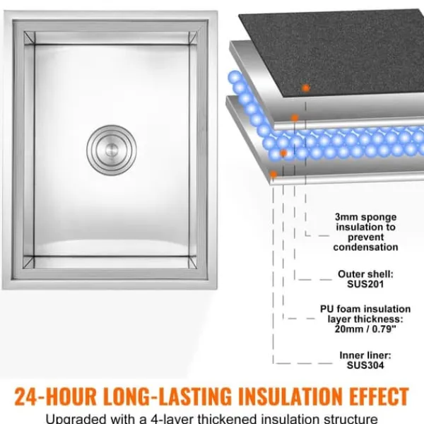 Livsmedelsklassat material: Hela kylbehållaren är tillverkad av rostfritt stål (insidan SUS304, utsidan SUS201), vilket gör den hållbar och rostbeständig. Insidan är fullt svetsad, vilket avsevärt minskar risken för läckage.