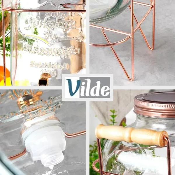 Detta set består av en burk med kran och ett burkställ. Perfekt för att servera vatten, lemonad, juice, iste, smaksatt vatten och till och med punch. Kranen gör det enkelt att servera dina favoritdrycker på ett imponerande sätt. Burken med stativ kan användas både i trädgården och vid familjesammankomster. Det låsbara locket förhindrar att insekter kommer in i din dryck. Den är gjord av hälsosäkra och livsmedelssäkra material. Ej lämplig för varma drycker. Notera! Förpackningen innehåller felaktig information om kapaciteten, den faktiska kapaciteten är enligt beskrivningen ovan.