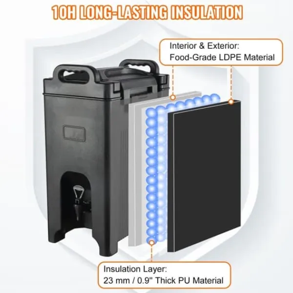 Stort 18,9 L kapacitet: Vi presenterar vår isolerade dryckesdispenser med en kapacitet på 5 gallon (18,9 L) som håller dina varma eller kalla drycker som juice, kaffe, mjölk och te vid den perfekta temperaturen. Vi är stolta över att använda livsmedelsklassade material för alla komponenter som kommer i kontakt med dina drycker. Upplev högsta kvalitet i dryckesservicen!