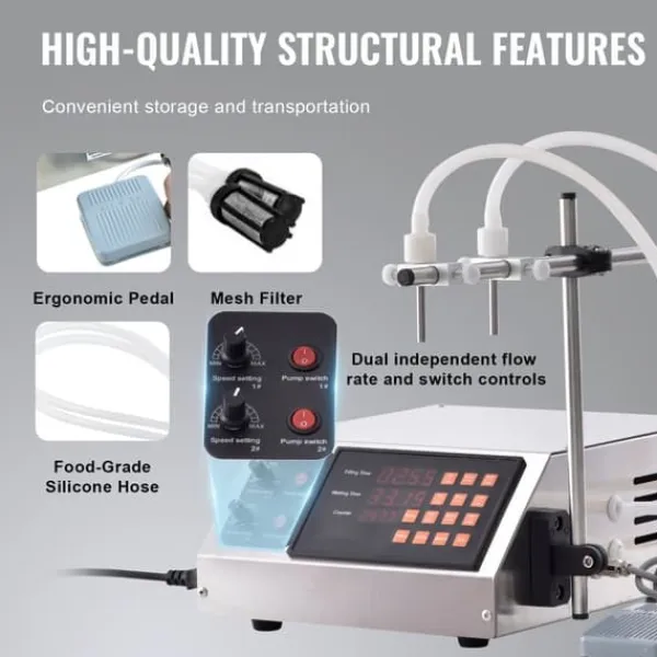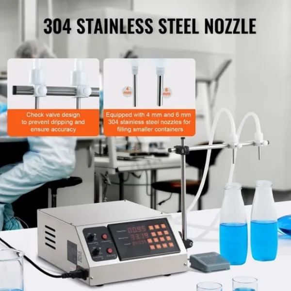 Inlopps- och utloppsslangarna på vår digitala vätskefyllningsmaskin är lättåtkomliga, vilket gör demontering och rengöring enkelt. Det rostfria höljet är inte bara korrosionsbeständigt utan också lätt att rengöra. Underhållet är en barnlek och säkerställer att din maskin förblir skinande ren.