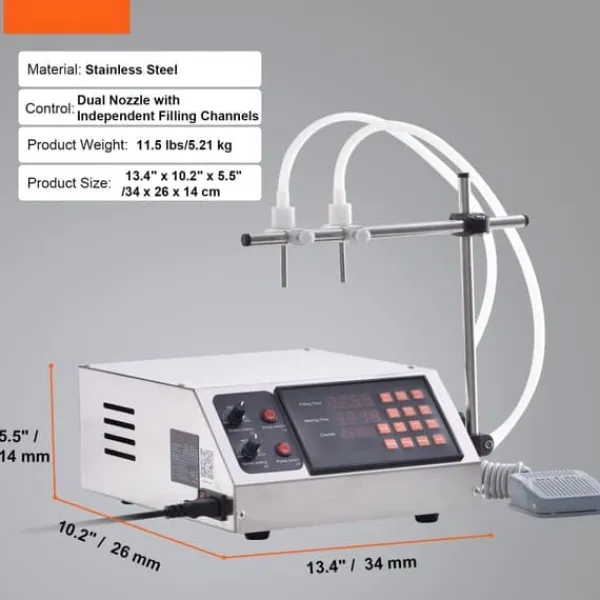 Denna fyllmaskin drivs av en robust membranpump. Inom ett intervall av 78,7″/2 m når den en maximal flödeshastighet på 125 fl. oz/min (3,7 l/min) för vätskor med låg viskositet. Den hanterar vätskor med låg till medelhög viskositet med lätthet. Från mjölk till vinäger, dessutom är den ditt förstahandsval för produktion av små serier. Observera: Tjockare vätskor flyter något långsammare.