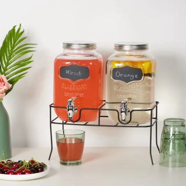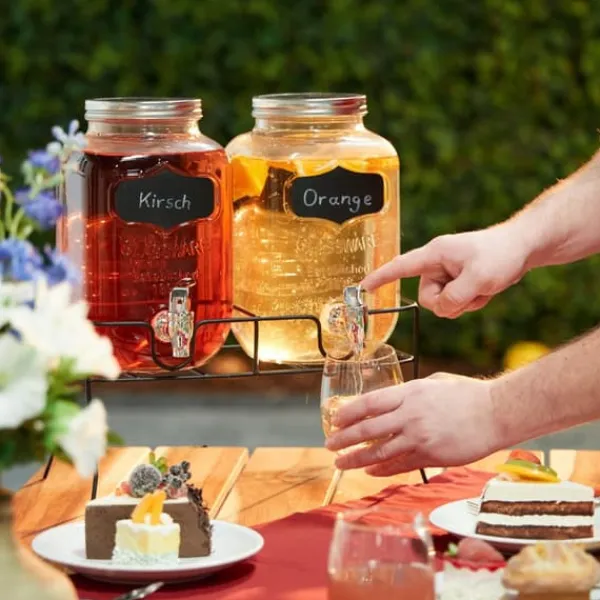 Detta set med två vintage dryckesdispenserare är perfekt för att servera drycker på trädgårdsfester, födelsedagar eller i din hemmabar. Varje dispenser har en praktisk tapp för enkel upphällning och en stilfull retrodesign med präglat glas. Det medföljande stället höjer dispenserarna för smidig åtkomst, medan etiketter och en märkpenna hjälper dig att organisera dina drycker.