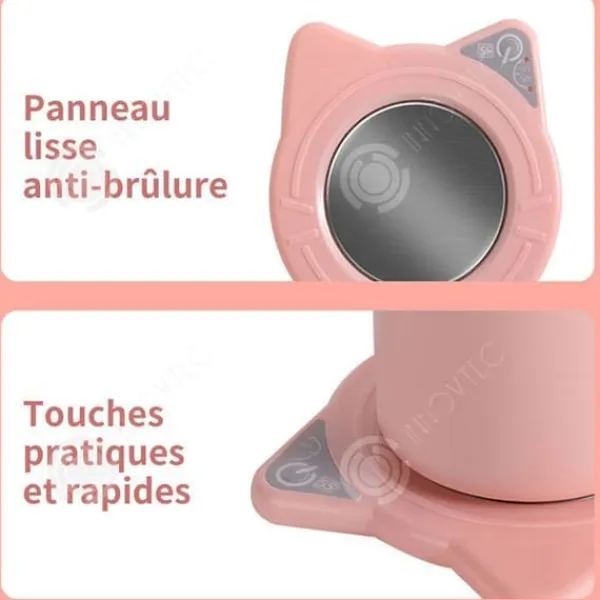 4. Omtänksam design: Denna produkt har en slät härdat glasyta som förbättrar värmeeffekten, motståndskraftig mot repor och brännskador. Knappen är placerad vid basen, placera bara koppen på den för att aktivera strömbrytaren.