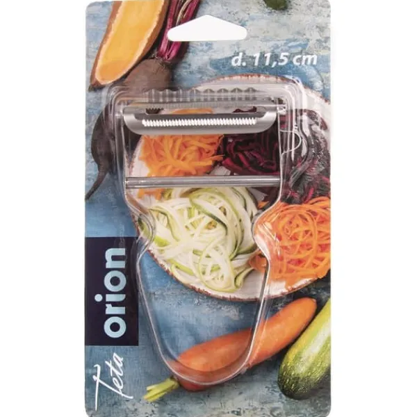 En dubbel frukt- och grönsaksskalare, användbar i alla kök. Den är perfekt för att snabbt och enkelt skala skal från saker som potatis, äpplen eller tomater. Perfekt för att skiva tunna skivor eller dekorera. Skalaren har ett praktiskt handtag och vassa blad, vilket gör den mycket bekväm att använda. Tack vare den kan du enkelt skala färska grönsaker och frukt. Originalprodukt från det tjeckiska märket Orion. Tillverkad i enlighet med europeiska standarder.