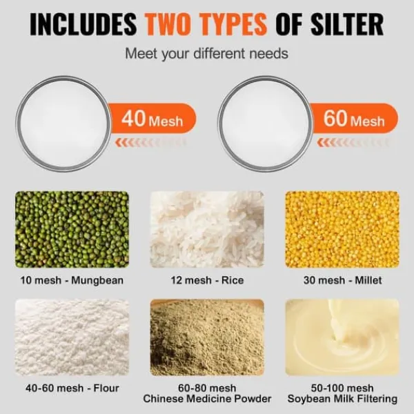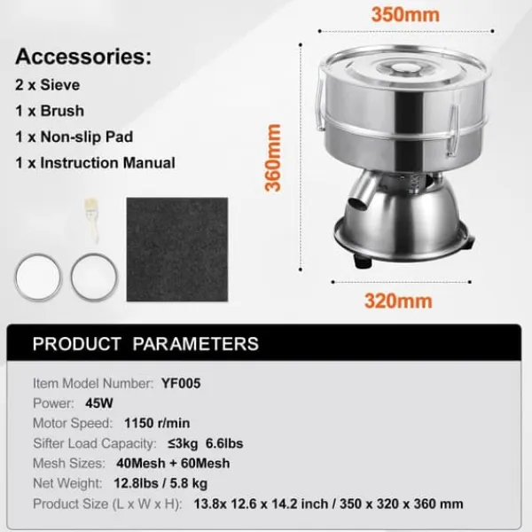 Sållshakern kommer med två stycken 304 rostfria såll, 40 mesh och 60 mesh. Du kan välja en baserat på dina behov: i allmänhet är en 40 mesh lämplig för mjöl, medan 60 mesh är idealisk för kinesisk medicinpulver. Vi erbjuder en mängd olika maskstorlekar för ditt val.