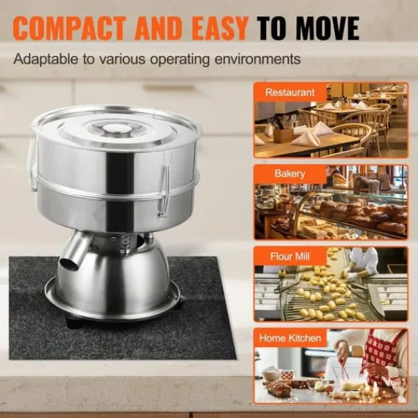 Vår vibrerande sikt kan installeras på vilken plats som helst utan att fixeras, vilket gör den lätt att flytta. Gummifotskydden och starka halkfria kuddar minskar buller, förhindrar halka och skyddar ytor, vilket säkerställer stabil och effektiv drift. Denna design används ofta i restauranger, bagerier, mjölkvarnar, hemkök och mer.