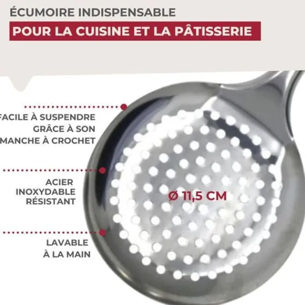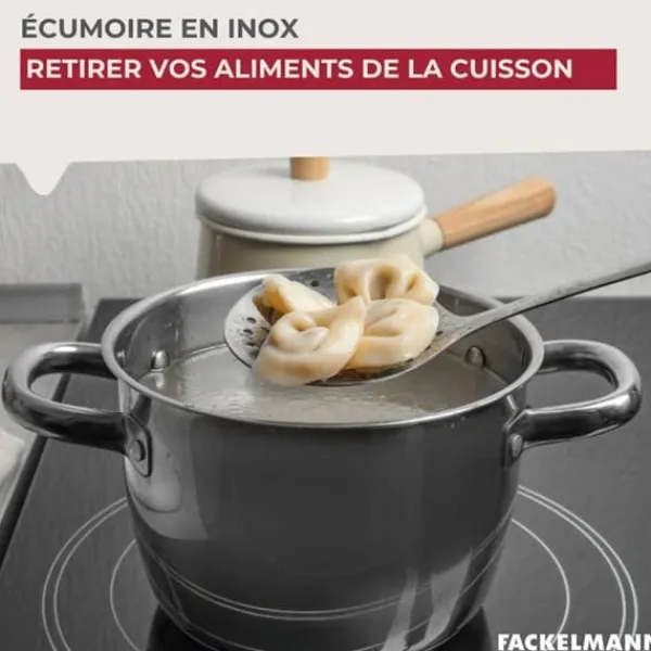 BESKRIVNING: Fackelmann erbjuder denna slitskopa i rostfritt stål, en oumbärlig produkt för att ta upp dina livsmedel från kokande olja eller kokande vatten. DET LILLA +: Tack vare kroken på det ergonomiska handtaget kan du hänga upp den för att alltid ha den till hands. SAMMANSÄTTNING: Tillverkad av rostfritt stål, ett hälsosamt och lättvättat material, robust och motståndskraftigt mot höga temperaturer. DIMENSIONER: 32,6 x 11,5 x 1,6 cm. ANVÄNDNING: För att utan att bränna dig ta upp dina donuts, ravioli, hårdkokta ägg, nuggets, karnevalsbeignets, accras, ostkroketter osv. Slitskopan är ett av de klassiska köksredskapen som alla bör ha. Faktum är att slitskopan gör det möjligt att ta upp livsmedel från en varm vätska utan att bränna dig och på säker avstånd från eventuella stänk. Den kommer att vara ovärderlig för att ta upp dina hårdkokta eller löskokta ägg från det varma vattnet utan att de går sönder, och för att ta bort dina friteringar som nuggets, beignets, karnevalsbeignets, accras, ostkroketter från den kokande oljan. Dessutom tillåter den att avrunna livsmedel.