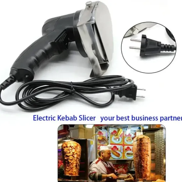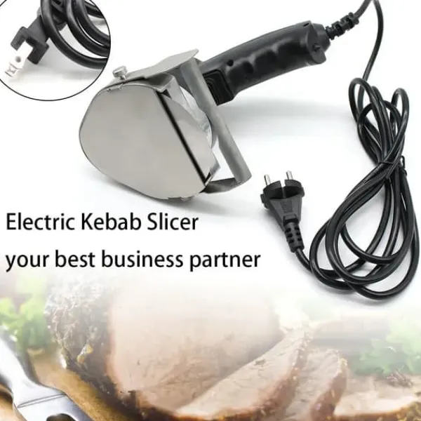 Kompakt elektrisk kebabskärare för jämna, precisa skivorHandhållen kebabskärare med supervass rund klinga (Ø 10 cm) i rostfritt stål, justerbar skärtjocklek 1–8 mm och tyst 80 W-motor. Perfekt för lamm, kyckling eller nötkött – snabb, ren och bekväm skärning med ergonomiskt grepp och avtagbar, diskmaskinssäker klinga.