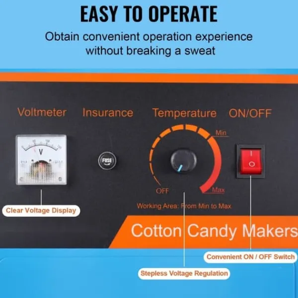 Vår elektriska godisflossmaskin skiljer sig genom att ha en spänningsmätare och en temperaturkontrollratt. Genom att enkelt ändra spänningen kan du justera temperaturen från 244,9°F/118,3℃ till 439,2°F/226,2℃. Det är ett måste om du vill experimentera med olika smaksättningar av socker.